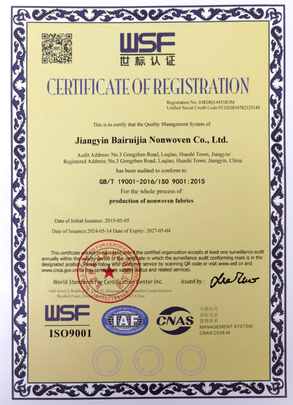 江陰百瑞佳無紡布有限公司坐落于江蘇省江陰市華士鎮,是一家專業從事無紡布研發、生產和銷售的企業,公司擁有雄厚的經濟實力,優秀的技術力量,專業的技術人員,致力于開發新品,提高產品質量。